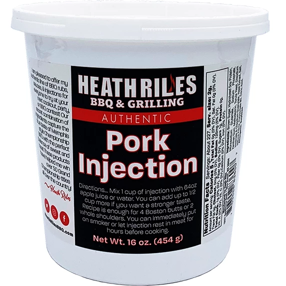 - Enjoy fast shipping and secure payment options when you order Heath Riles Pork Injection 16 Oz today. Perfect for BBQ enthusiasts and professional pitmasters alike!