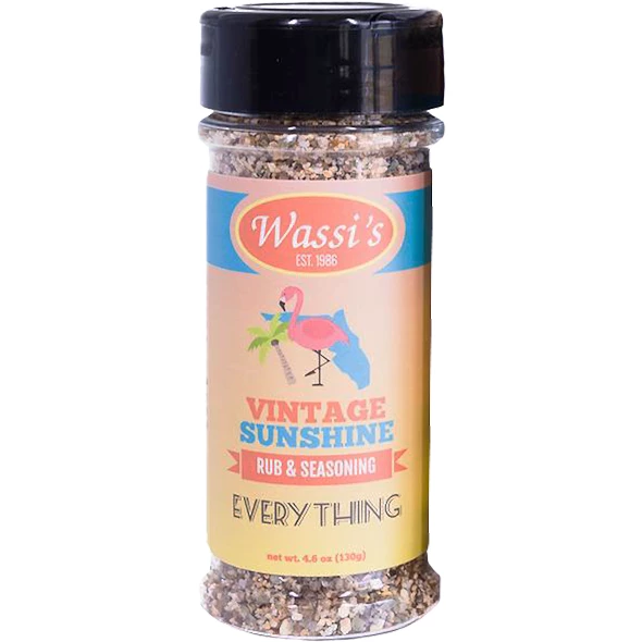 - Elevate your BBQ game with Wassi’s Vintage Sunshine Rub & Seasoning. This 4.6 oz blend is crafted with premium ingredients to deliver a bold, savory flavor that enhances grilled, smoked, or roasted meats.